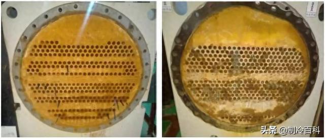 案例 2:某地铁项目使用某品牌的螺杆机,换热管清洗因清洗药剂使用不当导致铜管几乎全部腐蚀,系统进水。