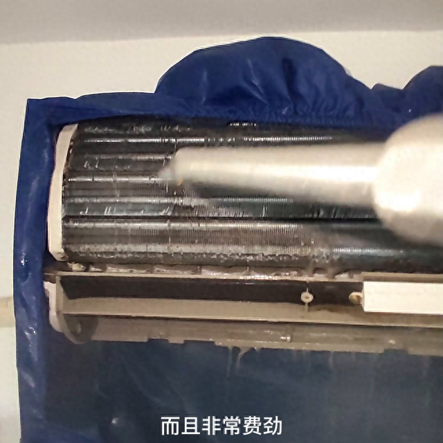 这是客户一个月前自己清洗的空调,但是效果并不理想。她用刷子刷飞轮和叶片,非常费力,但是污渍并没有完全清除。清洗剂可能有问题。这些污垢很难被分解。客户无法清洗水槽。虽然清洗剂可以拆卸外壳,但有些客户无法自行拆卸。