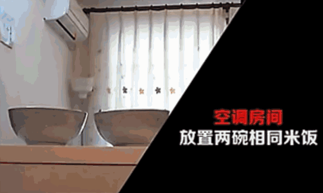在未清洗过散热片的空调风口放置两碗米饭,一碗敞露空调下,一碗被盖着。