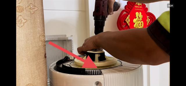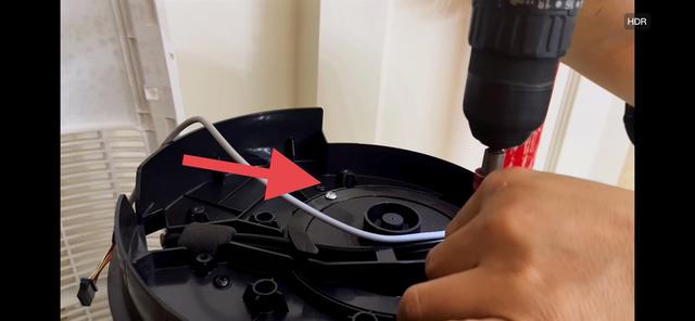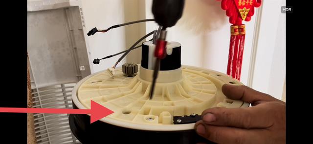 第六步,我们把圆盘凹槽上的这四颗螺丝卸下来,圆盘拿下来,我们把风轮上边盖子上的两颗螺丝卸下来,转一下把盖子拿下来,风轮下边有颗固定螺丝把它拧松就能把风轮提出来了
