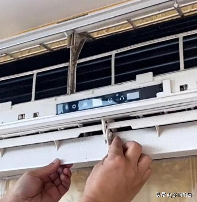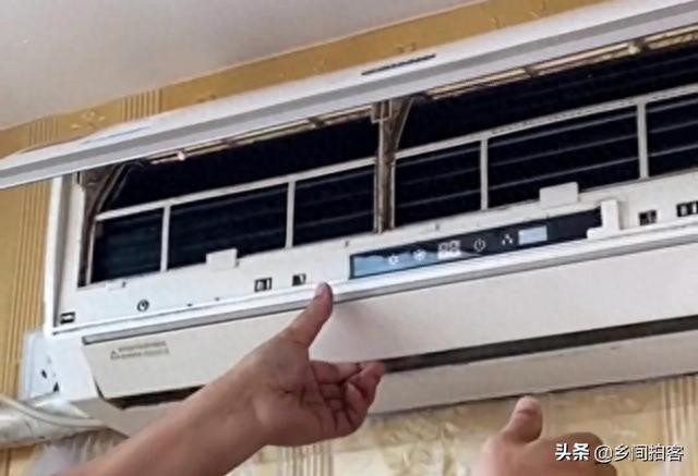 然后打开面板,抠住面板的两侧,空调的两侧往顺着劲,向上轻轻一推就开了
