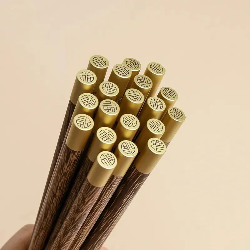 这套鸡翅原木筷采用,包金设计,圆福印字,象征着福星高照,招财纳福。