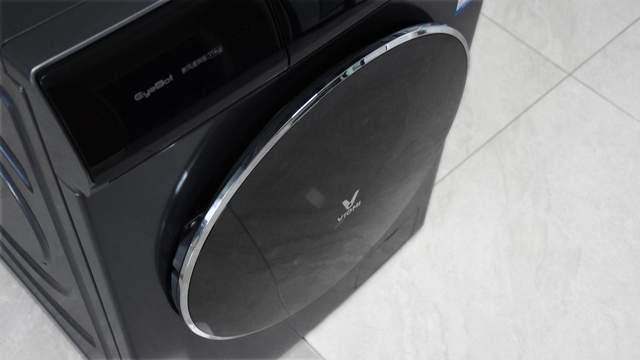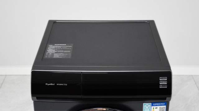 滚筒盖板采用半透明设计,外面覆盖有一块黑色塑料盖板,且微微向外侧凸起,透过盖板可以隐约看到滚筒里面。盖板中间有电镀工艺的云米Logo,周围镶嵌有一圈银色边条,起到些许装饰作用。