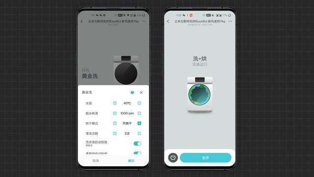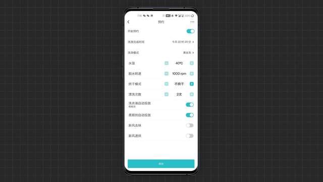 点击单个模式下方的设置小图标,进入到详细的设置选项,可以自定义水温、脱水转速、烘干模式、漂洗次数以及洗衣液、柔顺剂是否自动投放、开启新风去味和速烘功能等等。选择好以后点击下方的开始图标,洗衣机就开始工作了。