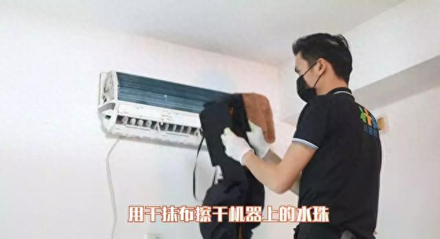 第6步:用湿毛巾擦拭空调正面、侧面、出风口和其他容易积灰尘的地方,擦拭完成后重新插电开机。