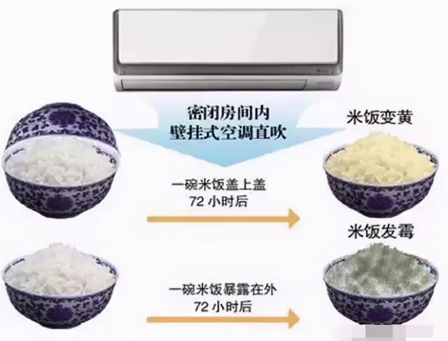 日前,中华预防医学会消毒分会专家和家安实验室工作人员,对空调污染进行了一场实验,结果令人瞠目:取两碗等量的白米饭,置于壁挂式空调下的桌子上,其中一碗盖好。72小时后,盖好的米饭只是略有变色,但敞露于空调下的那碗米饭,已经长毛,出现大片霉斑。
