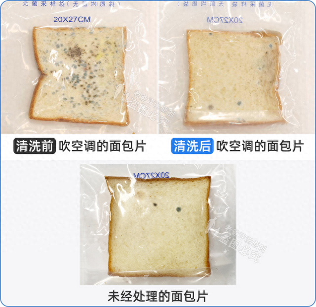 可以看到,清洗前吹空调的面包片已经变成「霉菌脸」,而清洗后吹空调的面包片,和我们准备的空白对照面包片一样,只有少数几个霉斑。