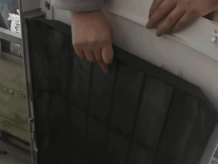 (二)过滤网一般在空调侧后方,找到过滤网把手,轻轻地从进风栅限位中脱出,向外拉出。