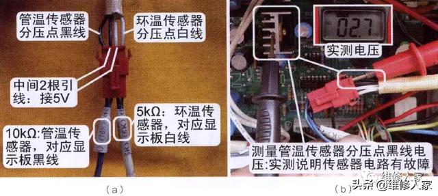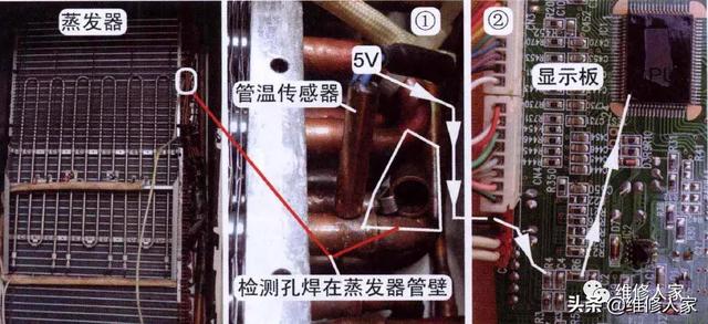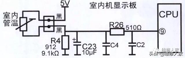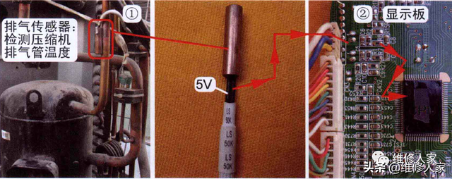 室外机设有室外环温、室外管温、压缩机排气共3个传感器,室内机和室外机的传感器连接线使用1束4根引线,其中1根为公共端直流5V为3个传感器供电,另外3根接3个传感器,直接送至显示板,显示板上3个传感器电路相对独立,由CPU的3个引脚各自分析处理。