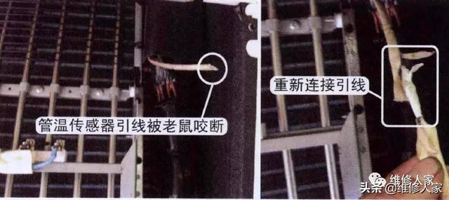① 由于饭店或食品店的场所,通常有老鼠的存在,空调器内的引线被老鼠咬断的事情经常发生。也就是说,如果是饭店使用的空调器,如测量引线(指传感器、室内外机连接线等)开路或短路,应首先判断是否为老鼠咬断引线。
