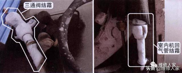 上门检査,空调器正在使用,在室内机出风口感觉几乎无风吹出。到室外机检査,见上图。发现三通阀严重结霜,取下室内机进风格栅,发现回气管(粗管)也严重结霜。