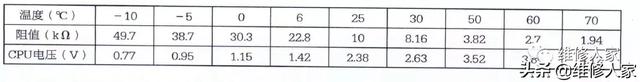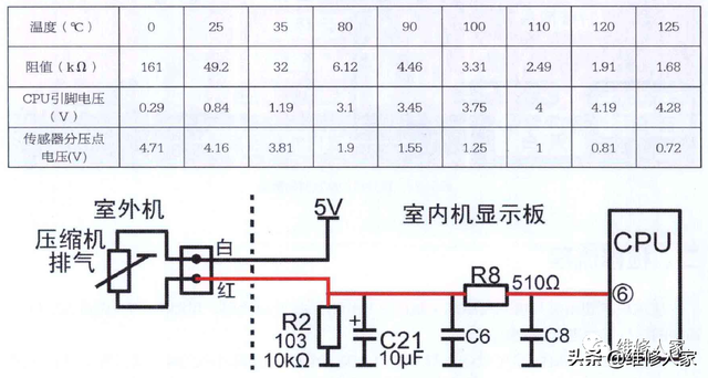 压缩机排气传感器电路原理图、实物图。压缩机排气温度传感器(25℃/50k)温度阻值与CPU引脚电压(分压电阻10k)的对应关系见表。
