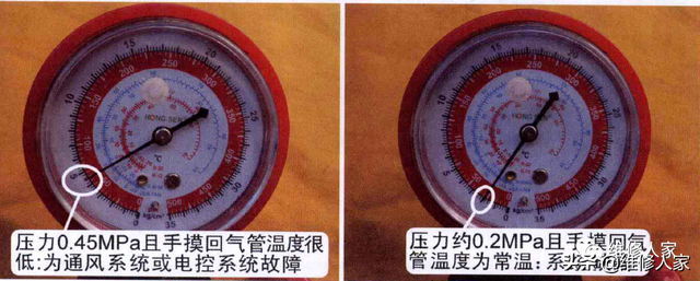 如运行压力约0.2(0.4以下、0.05以上)MPa且手摸回气管(粗管)温度为常温,则为制冷系统缺氟。