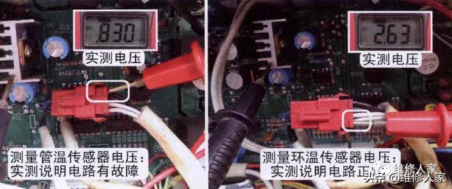 此处测量室内环温传感器电压只是为了对比室内管温传感器电压。判断室内环温传感器电路是否正常时,只需要査看显示屏显示的室内温度数值,通过与房间实际温度对比即可判断。
